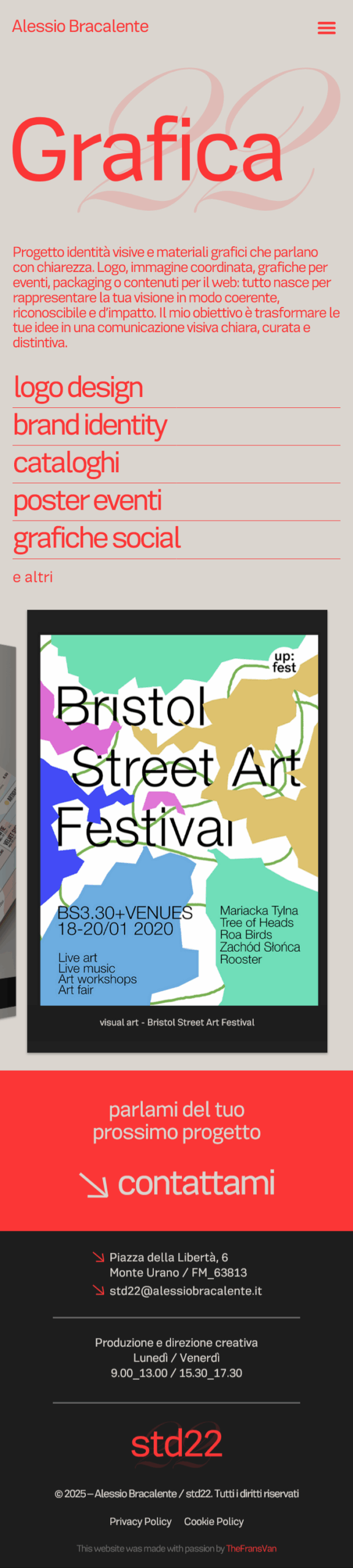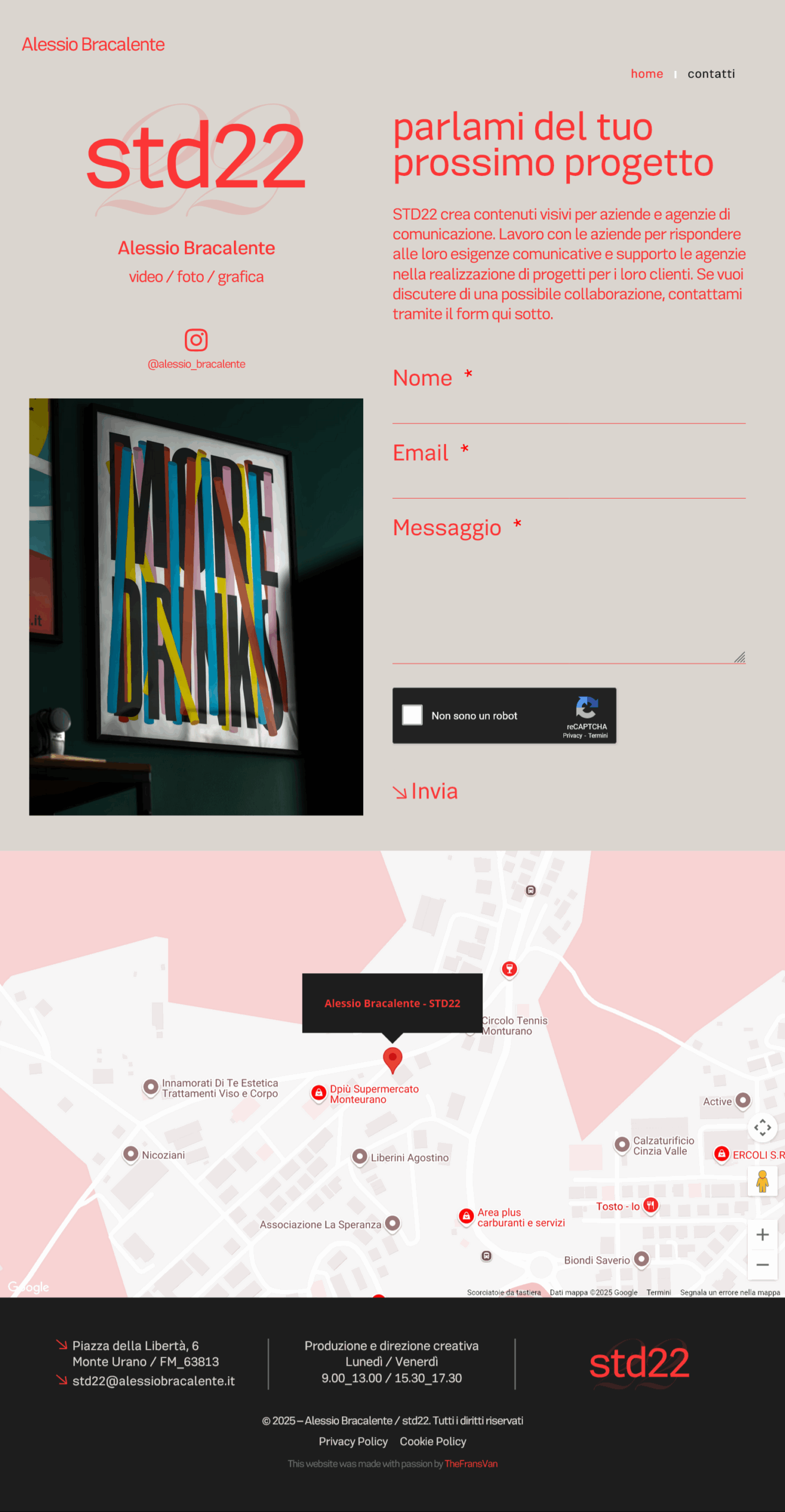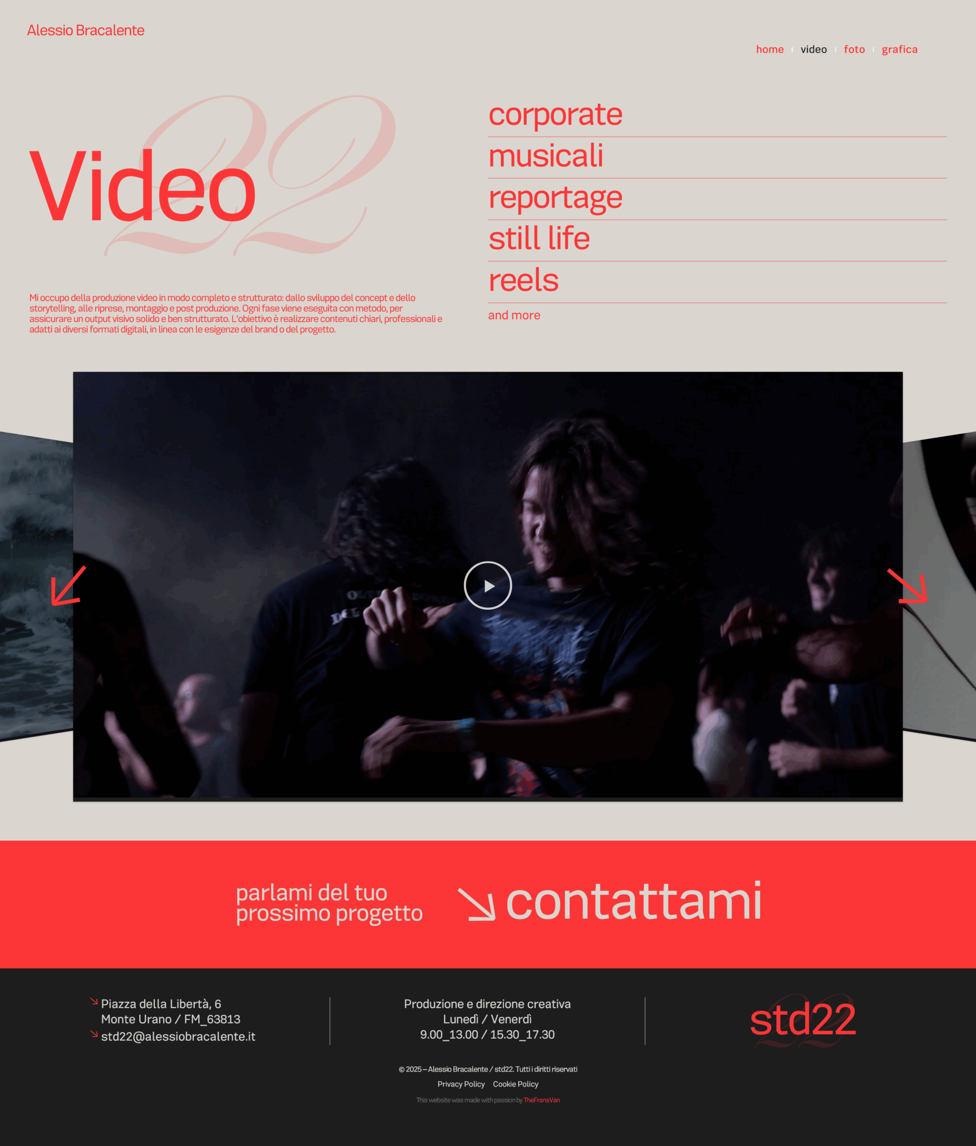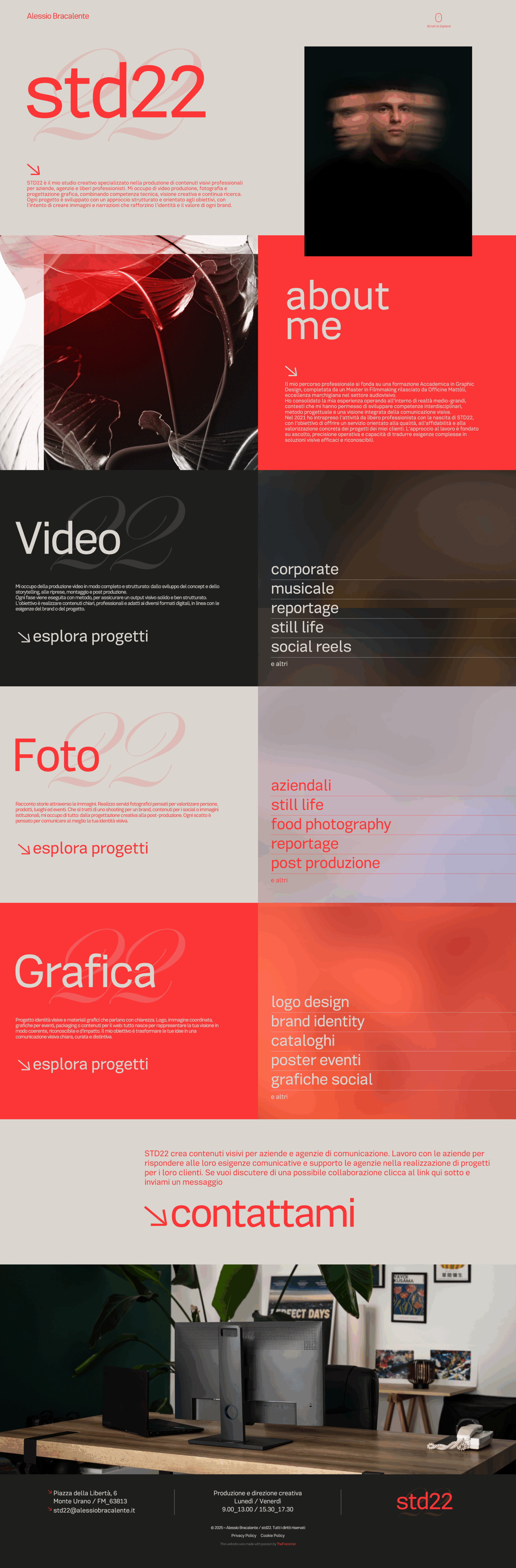 Sito web dedicato a Studio 22 di Alessio Bracalente, studio creativo per la produzione di contenuti fotografici, video e grafiche per social e aziende. Si è puntato su un layout semplice e cromaticamente caldo.